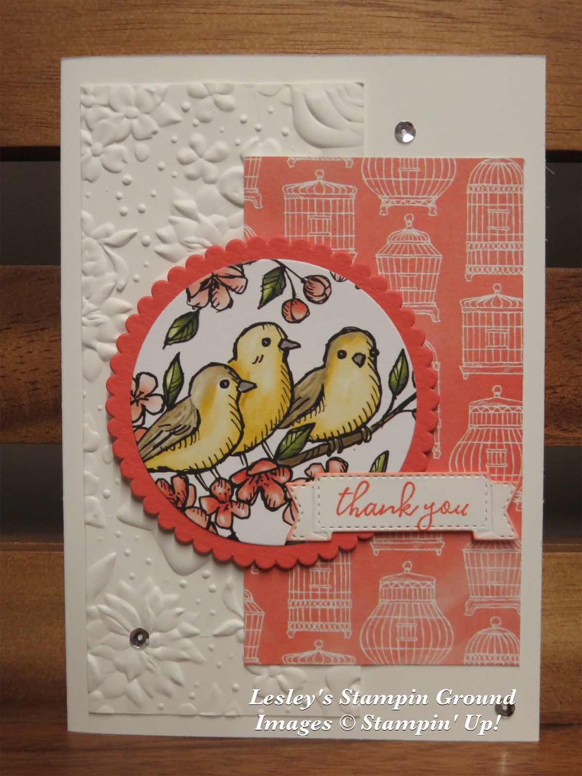 The base card and embossed card are Whisper White (#106549). I used the Country Floral 3D folder (#151823) to emboss the card. The birds from the Designer Series Paper and the Calypso Coral card (#124392) were both cut with the Layering Circles Dies (#141705). The bird cage paper is from the same DSP pack. I stamped “Thank You” with Calypso Coral ink (#147101) and the die to cut this is from the Smooth Sailing Dies (#149576). This was attached with Stampin’ Dimensionals (#104430).