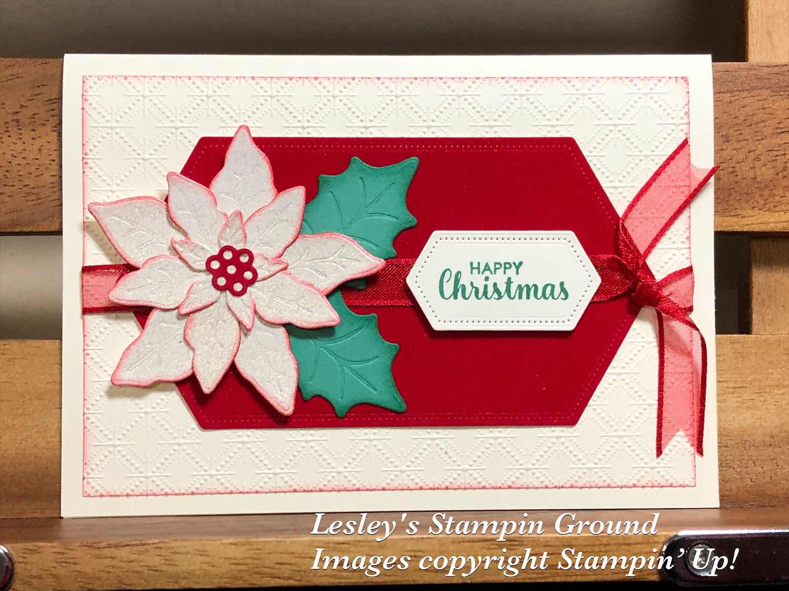 I have used Very Vanilla card (#106550) for the base and card front. I dry embossed the card front with the Dainty Diamonds 3D Embossing Folder (#152702) which is currently my favourite embossing folder. I sponged the edges with Real Red ink (#106578). I cut the Red Velvet Paper (#153490) with a Stitched Nested Labels Die (#149638) and attached this to the card. I wrapped the Real Red 3/8” Sheer Ribbon (#153535) around the card. Before cutting the Poinsettias I sprayed the Champagne Mist Shimmer Paint (#147044) on some Very Vanilla card. I cut 3 layers of the petals to make up the Poinsettia using the Poinsettia Dies (#153522). I used Just Jade card (#153084) for the leaves. I sponged the edges of the flower with Real Red ink and Just Jade ink (#153115) for the leaves. I also used the Red Velvet Paper for the flower centre. I assembled the flower with Mini Glue Dots (#103683) and attached the flower to the card with Stampin’ Dimensionals (#104430). “Happy Christmas” is from the Itty Bitty Christmas stamp set (#c150513) and stamped with Just Jade ink and cut with a Stitched Nested Labels die and attached with Dimensionals.
