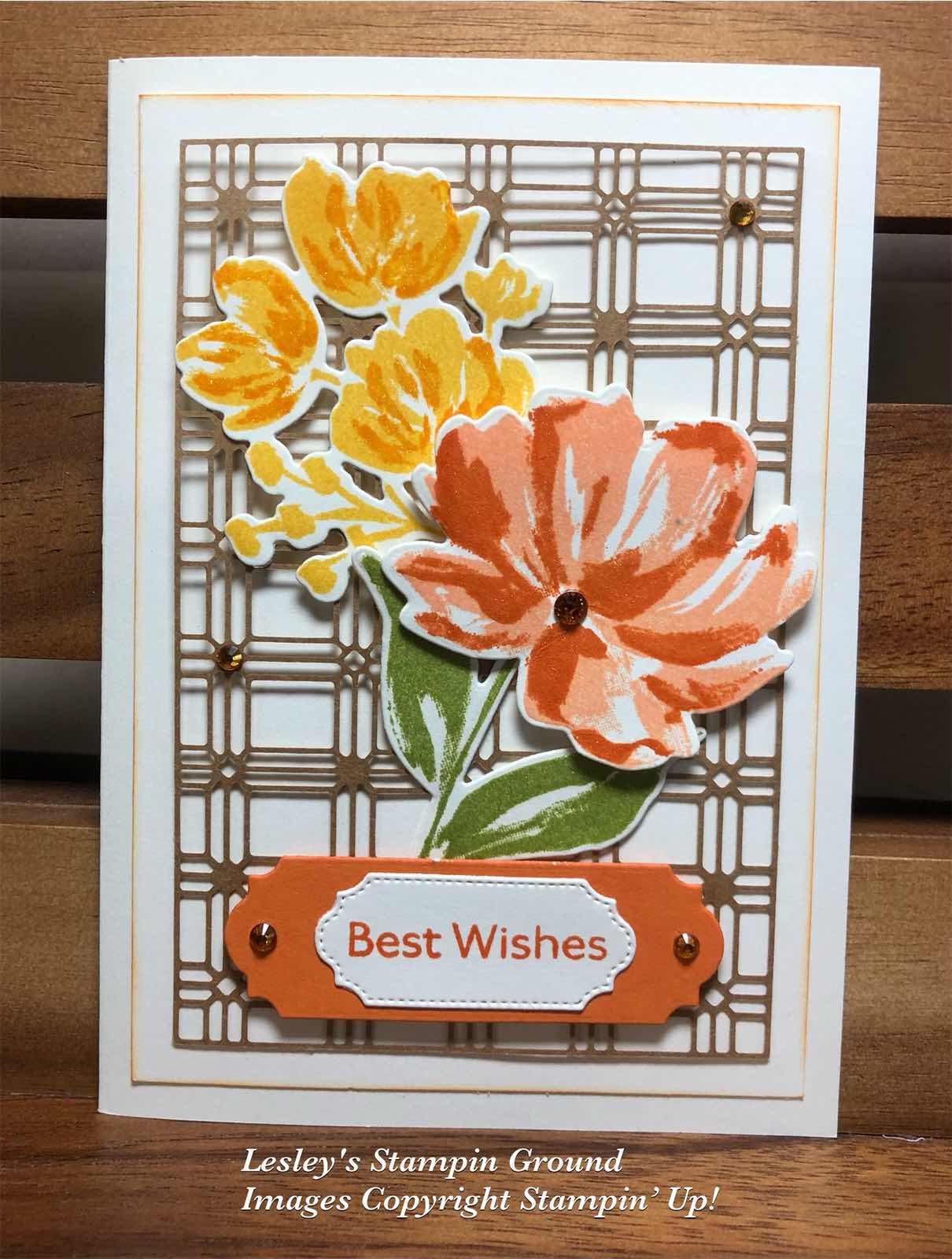 This stamp set is a Two-Step set which means you can stamp 2 images with different colours. For the single flower I stamped the darker colour with Pumpkin Pie ink (#147086), then stamped the lighter colour with Pale Papaya ink (#155670). The group of small flowers was stamped with Daffodil Delight ink (#147094) for the background and Mango Melody ink (#147093) for the darker colour. The leaves were stamped with Pear Pizzaz ink (#147104). All these stamped images were then cut with dies from the co-ordinating Floral Gallery dies (#154316).