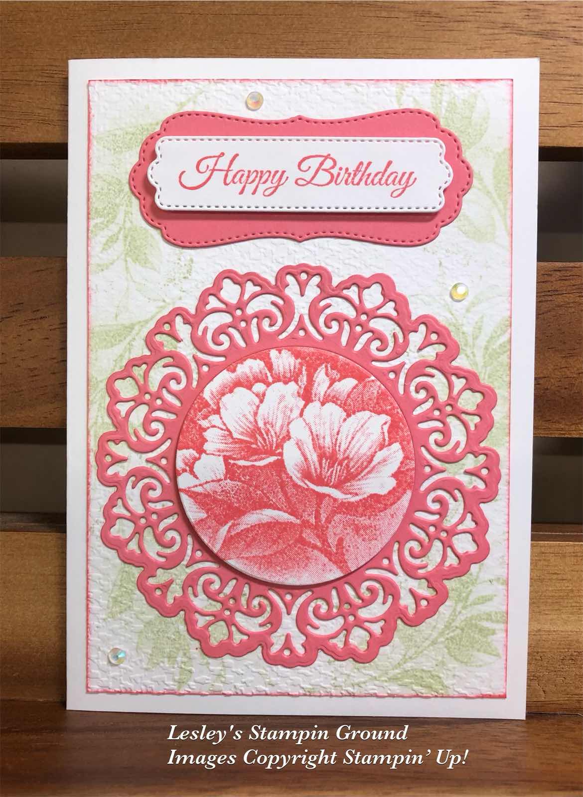 I stamped the flowers with Flirty Flamingo ink and cut it with a die from the Encircled In Beauty Dies (#155546). I only used the circle from the cut out. I then cut the Flirty Flamingo card (#141421) which was backed with Adhesive Sheet (#152334) with the same die for the outside detailed cut-out. This was attached to the card, then the circle with the stamped flower was attached with Stampin’ Dimensionals (#104430).