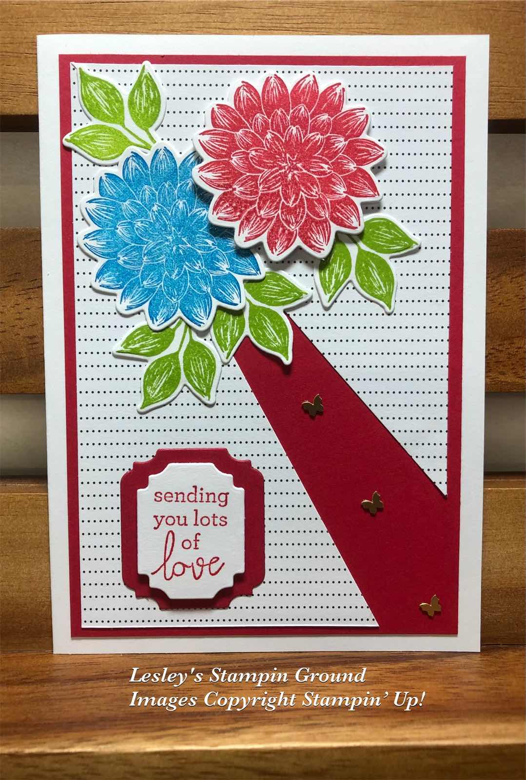 The dahlias, leaves and sentiment are all from the Dahlia Days stamp set (#157799). I used Pacific Point ink (#147098) and Real red ink (#147084) for the dahlias. The leaves were stamped with Granny Apple Green ink (#147095) and the sentiment with Real red ink. The flowers & leaves were cut with dies from the Detailed Dahlias (#157801). The dies to cut the sentiment and the Real Red card under the sentiment are from the Ornate Frames (#150664).