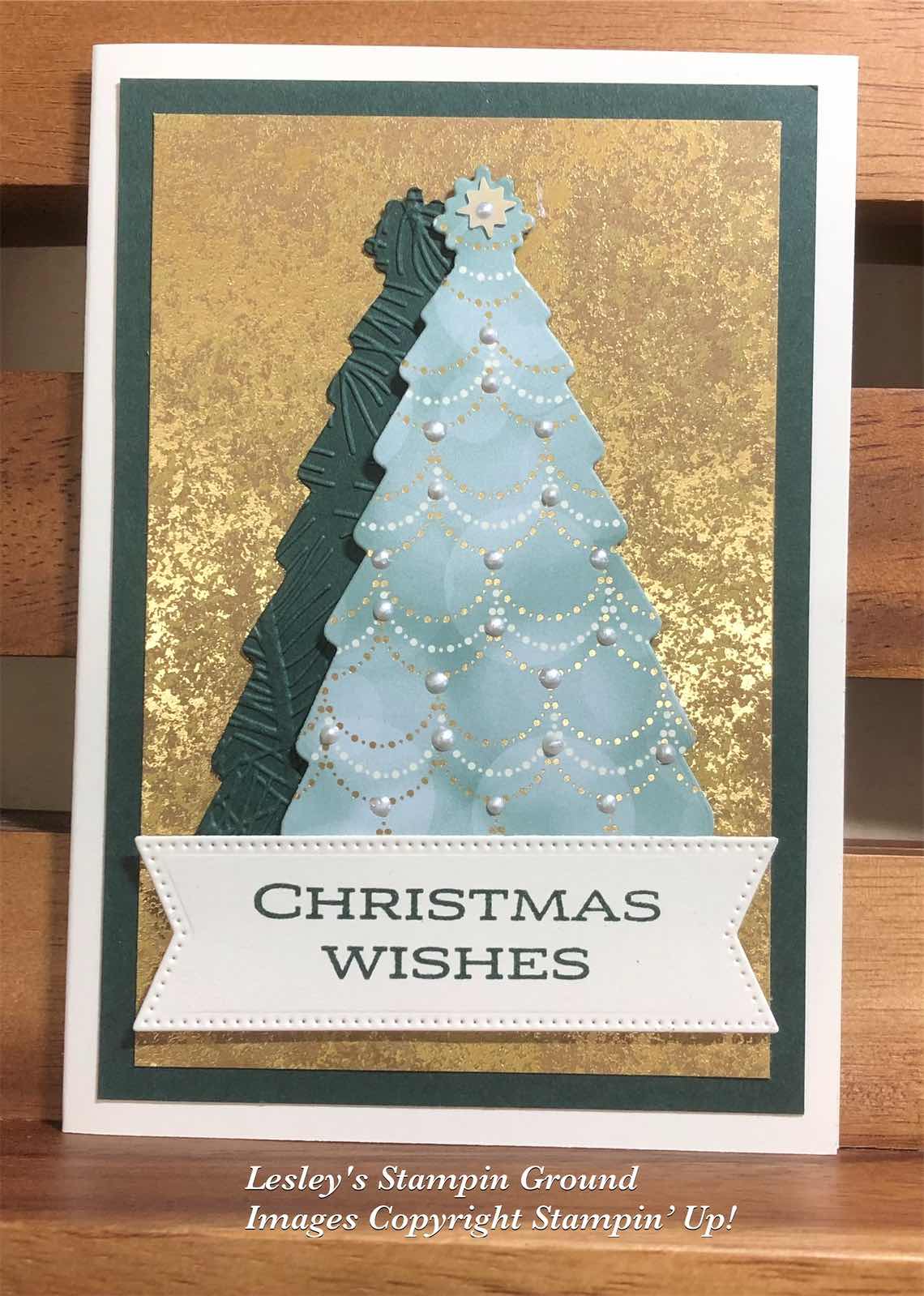 The Distressed Gold Specialty Paper (#159237) was matted with Evening Evergreen card, then attached to the Very Vanilla base card (#106550). The Evening Evergreen tree was taped to the card, then the other tree was attached with Stampin’ Dimensionals (#104430).