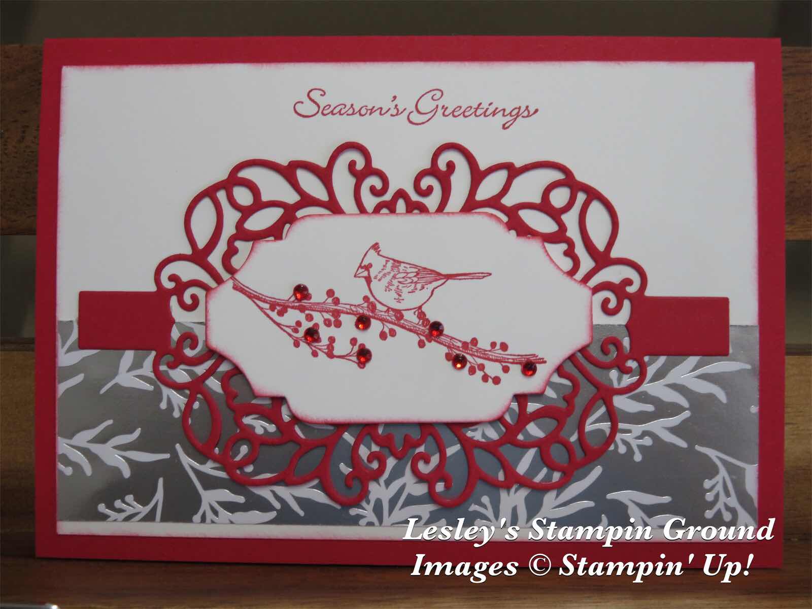 I stamped this image with Real Red ink (#147084) and cut it with a die from the Detailed Bands Dies (#149549). The detailed band is also cut with these dies and cut from Real Red card (#106578). The Designer Series Paper is from the Feels Like Frost 6” x6” Specialty Designer Series Paper (#150444) and attached to Whisper White card (#106549). The base card is Real Red. “Season’s Greetings” is from the Itty Bitty Christmas stamp set (#c150513) and stamped with Real Red ink. The Red Rhinestones Basic Jewels (#146924) were added to the “berries”.